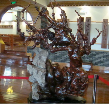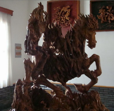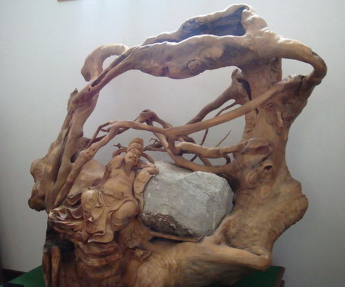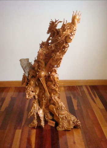 钱先生摇摇头又摆了摆手。“我现在是摇钱树下的穷人。我领你参观的‘中国精品根石艺术馆’里面展品件件都是稀世珍品,仅天然无饰的‘愚公移山’根石就有100多件,巨型的根石、根雕,像‘徐福东渡’、‘百鸟朝凤’、‘天马行空’、‘中华之龙’、‘琼岛台阁’、‘孔雀开屏’、‘四季紫气’(阴沉木化石)等等,举世无双,价值连城。北京来的部委领导和省里一些领导参观后感叹说,走了全国各地,想不到海岛有这么多的珍奇宝贝。不少人建议我卖掉一两件来办许多要办的事。但失去就难复得,我不是不舍而是不敢开头。有关部门能否让我以藏品进行抵押呢?”他说:“困难面前办法有不少,有个年旅游直接收入2亿元的中等城市来人,看了藏品提出让我提供展品(由他们选)给我1000万元补贴,他们在最繁华景区建书雕精品展馆,我点头,就意味着这里前功尽弃。另外,北京大学书画教授王岳川认为书雕可以开学科,邀我北上当客座教授,我若同意,与一己之私是有利的,但在困难面前则要算逃兵了。两难选择,我想首先自己要有定力,有决心、有智慧。”